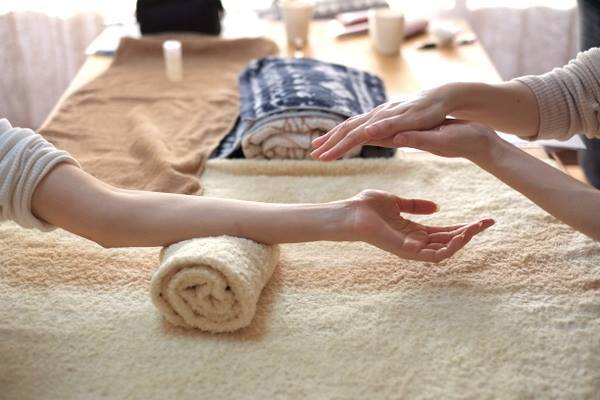 このセッションでは、手の関節や手のひら、肘から下に優しくアプローチしていきます。強い押圧などはありません。